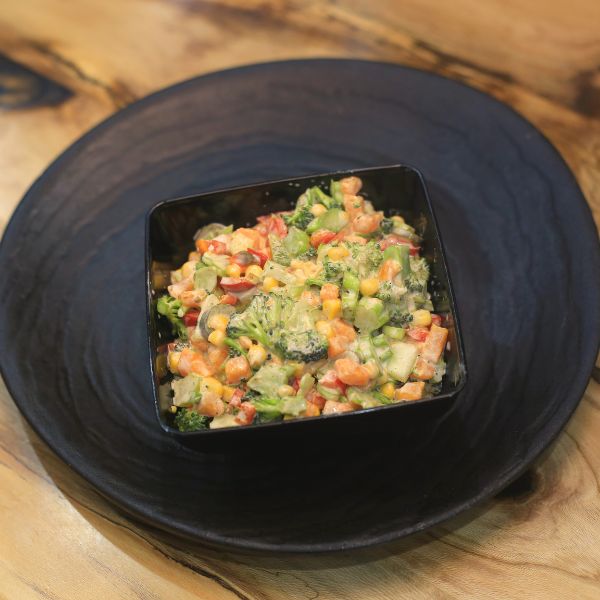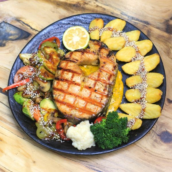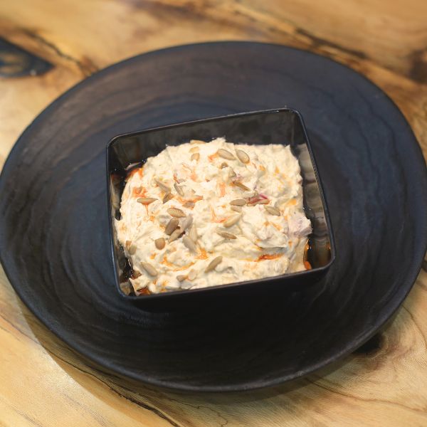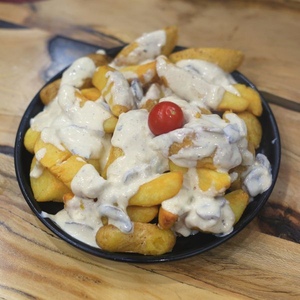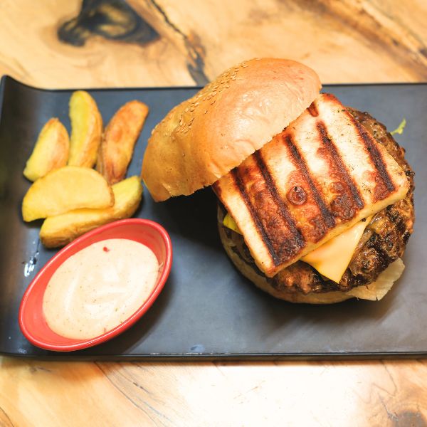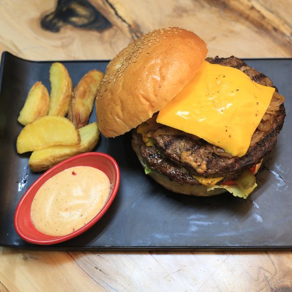 ۳۰۰ گرم برگر دستساز + ۱۵۰ گرم پنیر کبابی + پنیر گودا + گوجه + خیارشور + کاهو + سس مخصوص + پیاز کاراملی