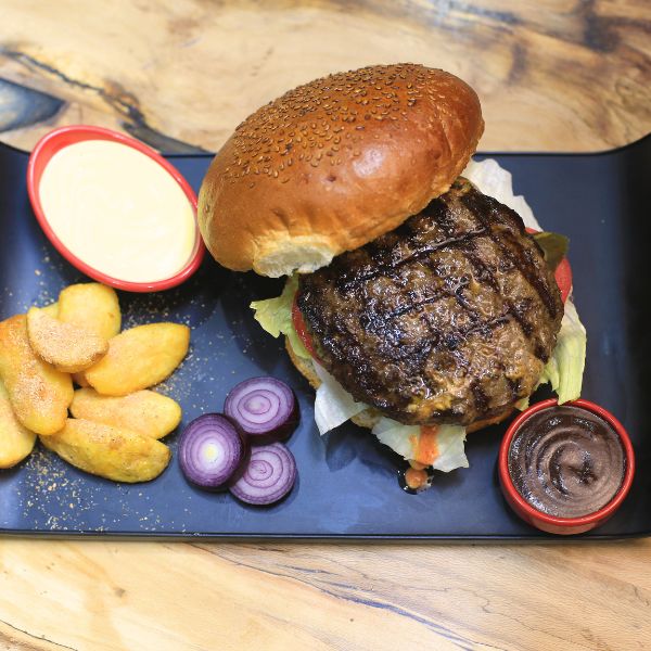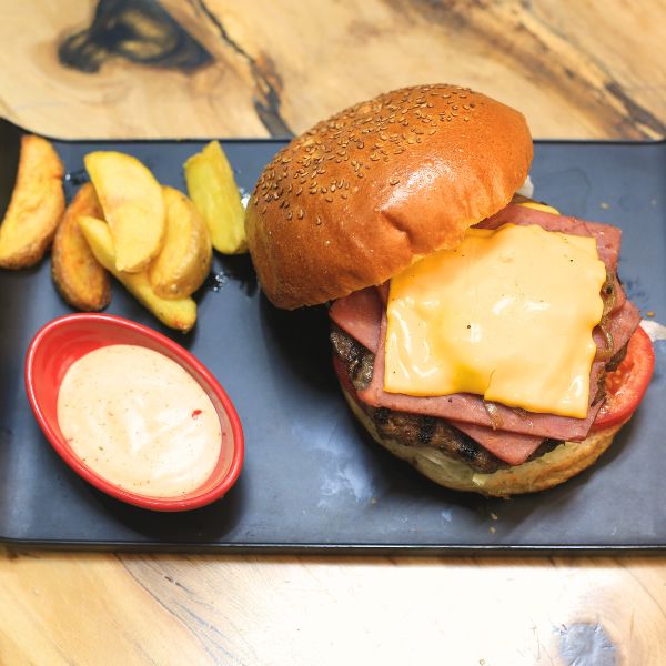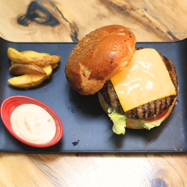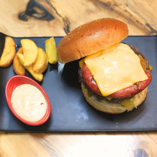 ۲۰۰ گرم برگر دستساز + پنیر گودا + گوجه + خیارشور + کاهو + سس مخصوص