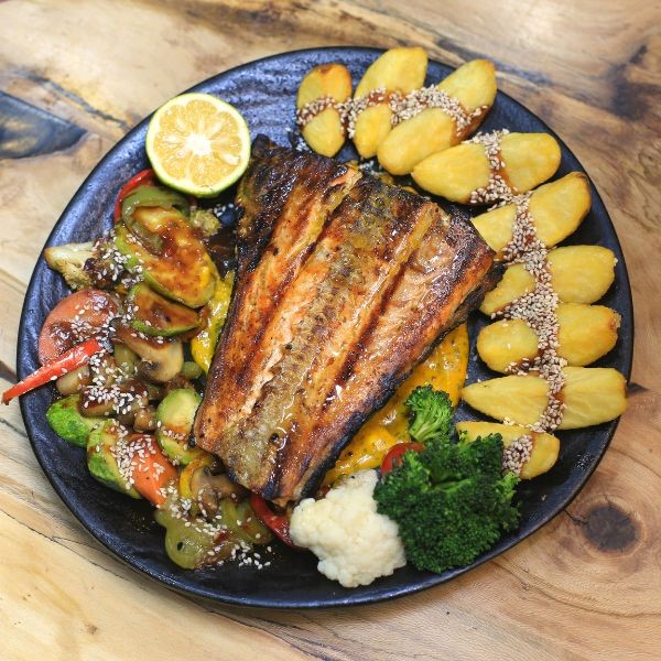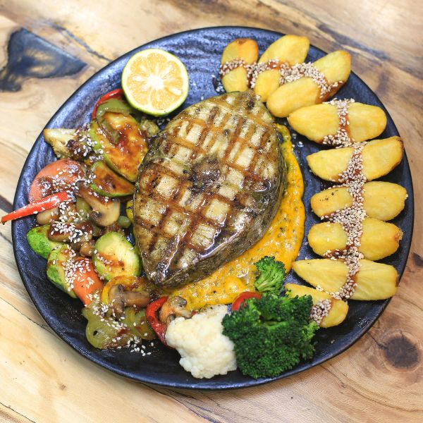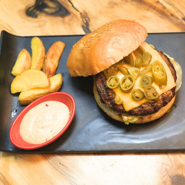 ۲۰۰ گرم برگر دستساز + ۲ ورق پنیر گودا + فلفل هالوپینو اسلایس + گوجه + خیارشور + کاهو + سس مخصوص + پیاز کاراملی